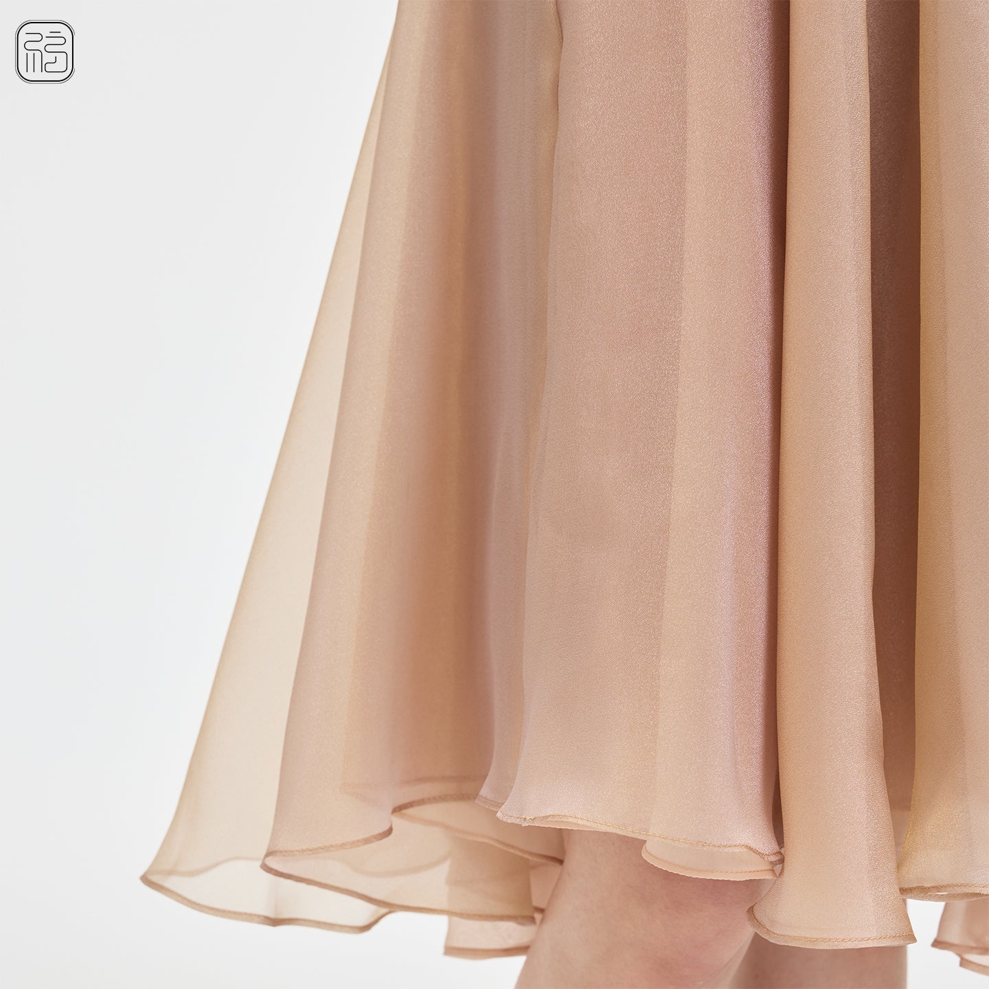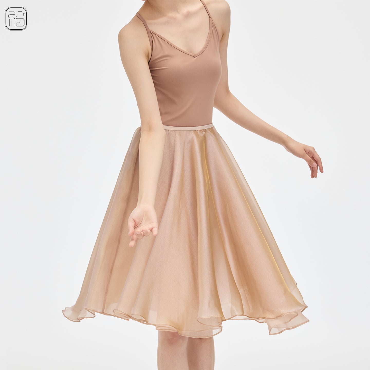 Double-Layered Pearlescent Gold Ballet SkirtCrafted from premium delicate pearlescent gold fabric, this skirt features a double-layered design that not only ensures a full, layered silhouette but also enhances the overall luminous texture. Precise tailoring guarantees dancers' flexibility and comfort during performances, seamlessly balancing aesthetics and functionality. It empowers dancers to showcase professional stage presence and elegant charm.
